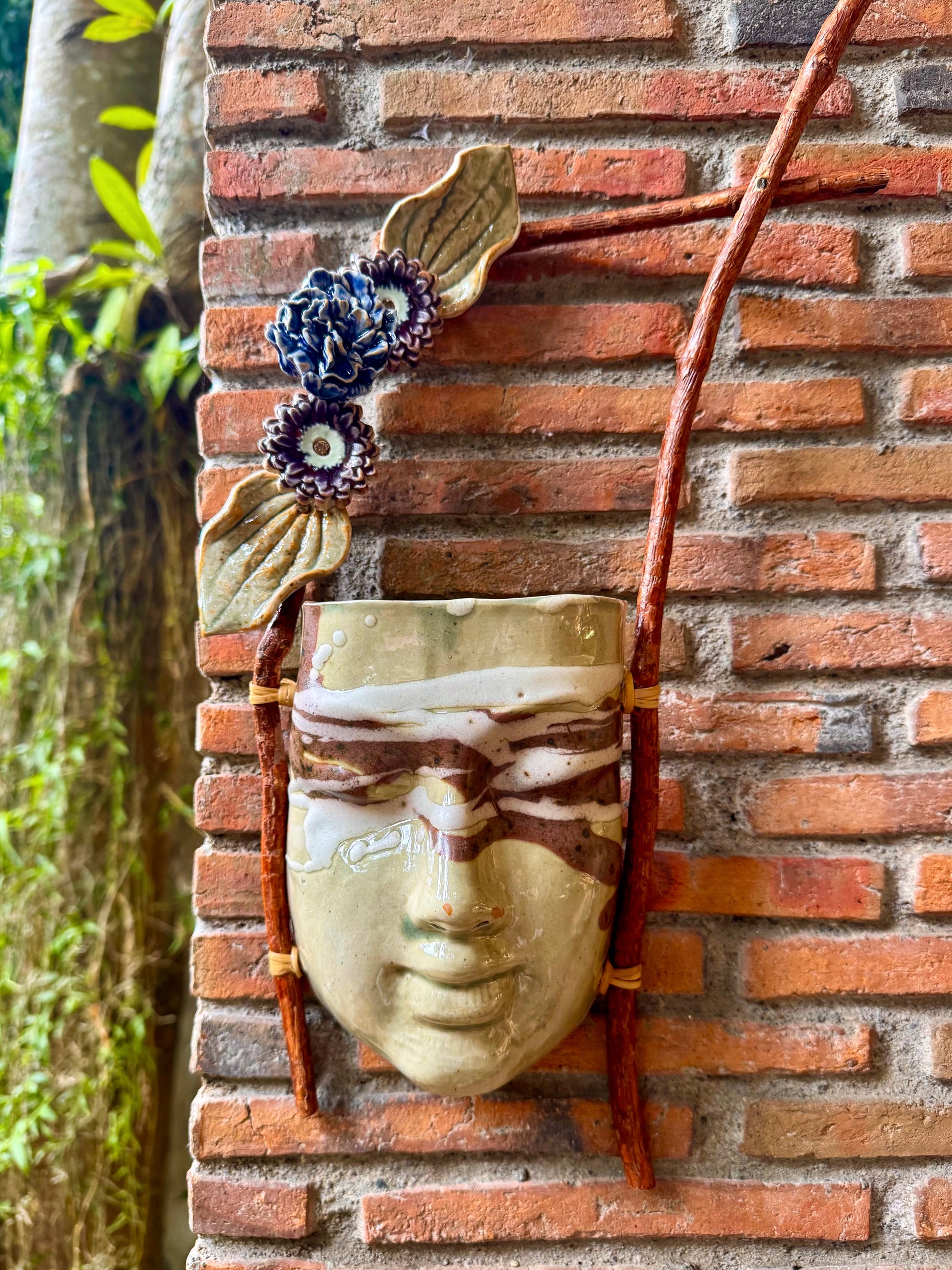 Mask w/ Flowers Wall Hang (White & Reddish Brown on Celadon Glaze)